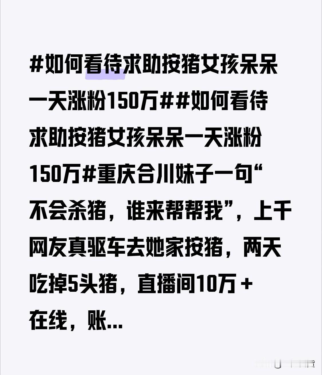 重庆合川妹子一句“不会杀猪,谁来帮帮我”,上千网友真驱车去她家按猪,两天吃掉5头猪,直播间10万+在线,账号一天飙粉150万!没有滤镜、没有剧本,只有热气腾腾的刨猪汤和“一方有难八方支援”的乡土荷尔蒙。事实证明:真诚才是流量王炸,乡愁才是顶级算法。下一个现象级爆款,会不会轮到你?