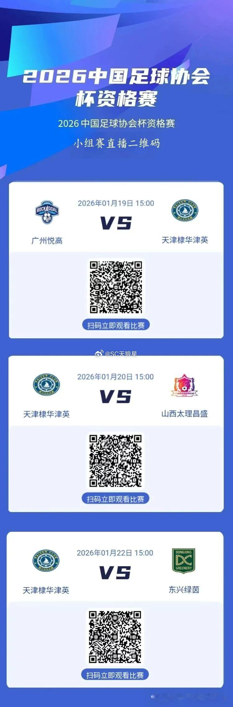 明天下午,2026中国足协杯资格赛正式开始。天津棣华将面对第一个对手,来自广东的广州悦高队。第二张图片,有比赛直播的二维码。将到现场为球队加油助威。中国足协杯天津棣华