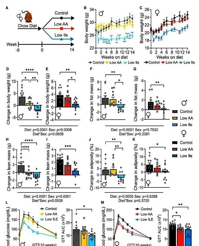 一是饮食分组的设计很有讲究,三个组“同台竞技”,对照组正常吃,低氨基酸组把所有氨基酸都减掉三分之二,低异亮氨酸组只减异亮氨酸三分之二。