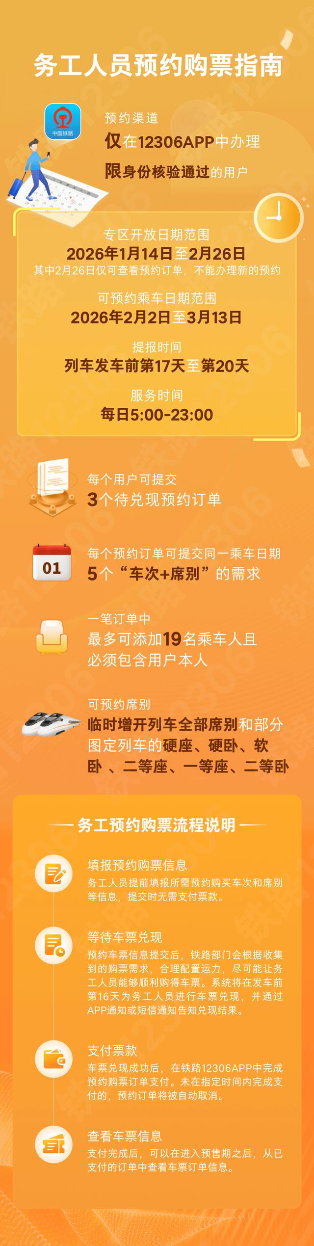 1月14日至2月26日(其中2月26日仅能查看预约订单,不办理新预约业务),已通过实名制核验的务工人员可在铁路12306手机客户端“务工人员春运预约购票服务”专区,预约购买2月2日至3月13日的火车票,同一账户最多可同时提交3个订单,每个预约订单可提交同一乘车日期不超过5个“车次+席别”组合需求,最多可为包含本人在内的19名旅客预约。