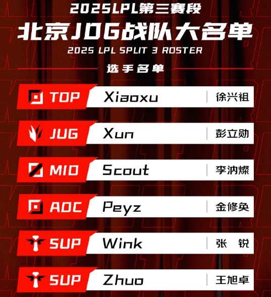 在S15第三赛段JDG组成了Xiaoxu、Xun、Scout、Peyz、Zhuo的组合,但是整体成绩不如预期,冒泡赛不敌全神班iG无缘S15世界赛。