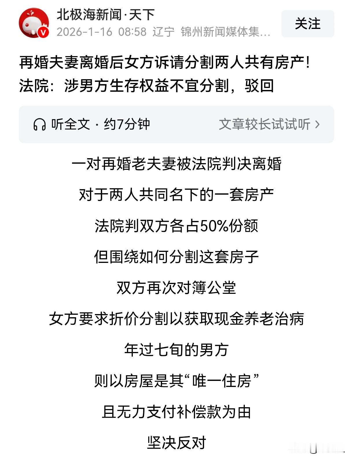 海南海口,女子和男子再婚,婚后两人没有生育子女,男子大哥送了一套房子给他们,登记在他们夫妻名下。后女子回湖北照顾母亲,夫妻二人长期分居两地,女子起诉离婚,法院判决两人离婚,房子各占50%的份额。女子主张分割房子,房子归前夫所有,前夫把房屋折价款给她。男子却不同意分割,说这是他的唯一住房,自己没有能力支付数十万甚至近百万的房屋折价款,并且前妻有房居住。法院判决让人意想不到。 万女士和胡先生于2003年登记结婚,两人都是再婚,婚后万女士跟着胡先生在海口居住生活。 两人在一起多年后,胡先生的大哥看弟弟弟媳没有房子,一直居无定所,心里很不是滋味。 出于对弟弟一家的关爱,2012年,他将一套房产赠与给了弟弟弟媳,房子登记在胡先生和万女士夫妻名下,这也是他们夫妻唯一的共同财产。 两人有了自己的房子,本应该安居乐业,好好生活,可3年后,万女士接到老家电话,说母亲患病,需要人照顾。 2015年,万女士放心不下母亲,从海口回到湖北照顾母亲,而胡先生则留在海口生活。 从那以后,夫妻二人长期分居两地,感情渐渐淡了,之后万女士起诉离婚。 2024年,法院判决准许两人离婚,海口的那套共同房产两人各自拥有50%的份额。 考虑到胡先生已经年过7旬,这套房子也是他唯一的住房,而且他根本没有能力支付高达数十万甚至近百万的房屋折价款,法院并没有强行分割房产,而是让房产维持共有状态。 也就是说这套房子由万女士和胡先生共同共有。 可万女士却认为她和胡先生已经不再是夫妻关系,自己作为拥有一半产权的共有人,有权随时要求分割房产。 她称自己年岁已高,且身体不佳,需要资金用来养老和医疗,因此希望分割房产,房子归前夫胡先生所有,胡先生向她支付房屋折价款。 面对前妻的诉求,胡先生又气又急,他表示这是自己晚年居住生活的唯一住房,自己年老多病,没有收入来源,压根没办法筹集到数十万,乃至近百万房屋折价款。 他和前妻结婚20多年,共同生活10多年,前妻明明在湖北还有房子居住,条件比自己好,却还要求分割房产,让自己给钱,也太不近人情了。 如果这套房子被强制拍卖或者变卖,自己将面临无家可归的境地,因此他不同意分割房产,希望这套房子暂时保持共有的一个状态。 沟通无果后,万女士将胡先生告上了法庭。 从法律角度来说,该如何看待此事呢? 有人说,这套房子既然是胡先生大哥赠与给他们的,那么胡先生大哥还可以要求撤回赠与吗? 《民法典》第657条规定:赠与合同是赠与人将自己的财产无偿给予受赠人,受赠人表示接受赠与的合同。 《民法典》第658条规定:赠与人在赠与财产的权利转移之前可以撤销赠与。 这套房子是胡先生的大哥于2013年赠与给他们夫妻的,赠与房产已经登记在他们两人名下,权利转移已经完成,因此是不能撤销赠与的。 夫妻在婚姻存续期间取得的房产属于夫妻共同财产。 万女士和胡先生离婚时,法院也判决这套房子两人各自占有50%的份额,共同共有。 房屋属于共有状态的,共有人在有重大理由或者共有基础丧失的情况下是可以请求分割的。 《民法典》第303条第2款规定:没有约定或者约定不明确的,按份共有人可以随时请求分割,共同共有人在共有的基础丧失或者有重大理由需要分割时可以请求分割。因分割造成其他共有人损害的,应当给予赔偿。 万女士主张自己年纪大了,身体不好,且自己跟胡先生已经离婚,失去了房屋共有的基础,她要求分割房产,案涉房屋归胡先生所有,并向她支付折价款。 万女士和胡先生都是案涉房屋的共有人,对共有物进行分割、变卖等处分行为,须全体共有人的一致同意,胡先生明确表示不同意对案涉房屋进行分割。 法院认为:胡先生年过7旬,没有收入来源,也没有经济能力支付房屋补偿款,案涉房屋系他目前唯一的住房,万女士主张分割房产的诉求不具有必要性和紧迫性,应当保持现状。 最终,法院驳回了万女士的诉求,房子维持两人共有状态。 万女士不服,提起上诉,二审维持了原判。 这套房子其实万女士和胡先生都是可以居住使用的,只是万女士在湖北,没有回海口,可能暂时用不上。 有人说,夫妻一场,两人年岁已高,都需要为对方多考虑一点,让彼此能够安度晚年。 也有人说,如果实在谈不拢,两人可以一起商量,把房子卖了,胡大爷拿着自己的一半房款,买一个小一点的房子用来养老。 大家觉得这样可行吗?