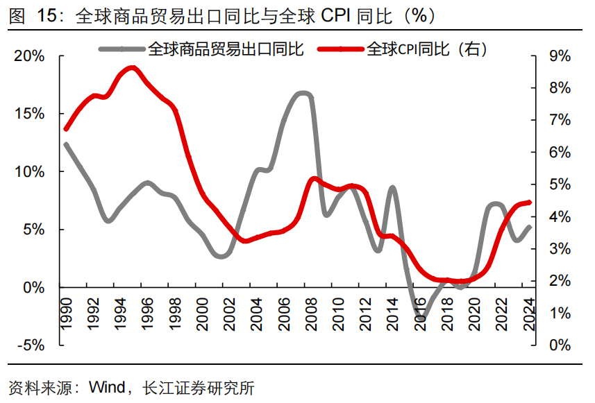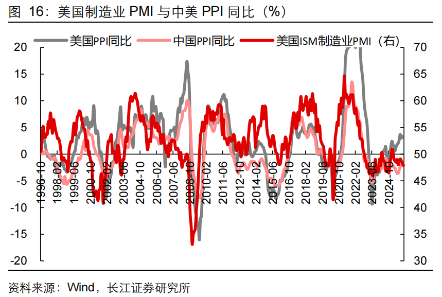 二是价的影响,或将加速逆全球化下的成本通胀。回顾历史,人口爆发式增长、科技革命和全球化,曾使得21世纪初全球经济、贸易迎来繁荣,并将通胀保持在温和较低水平。但在逆全球化、各国再工业化的大背景下,无论是以邻为壑还是产业备份,都会带来资本开支扩张,并带动大宗原材料需求不断攀升,尤其是工业金属供需格局正迎来明显改善。历史上,我国PPI与以美国制造业PMI、PPI为代表的全球工业需求走势高度一致。
