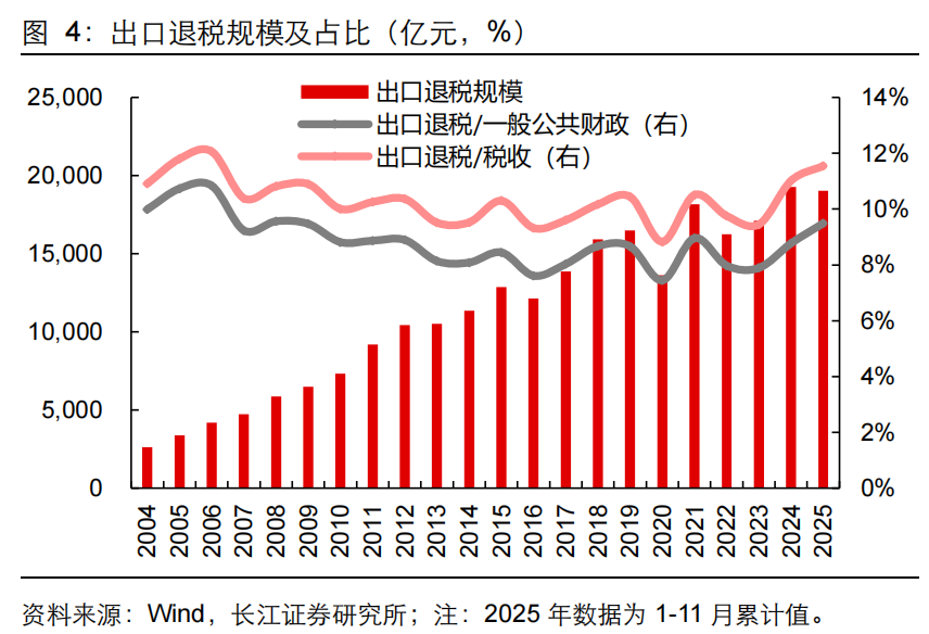 与此同时,在出口保持韧性增长的背景下,出口退税规模也水涨船高,2025年已达1.9万亿元,平均出口退税率为7.1%,取消不必要的出口退税将有助于稳定我国宏观税负。以光伏、电池等产品2024年出口额估算(两者出口额分别在8400亿、4700亿元左右),我们预计:2026年能够增加税收收入670亿元左右;至2027年取消电池出口退税后,增加的税收收入将进一步提升至1200亿元左右。