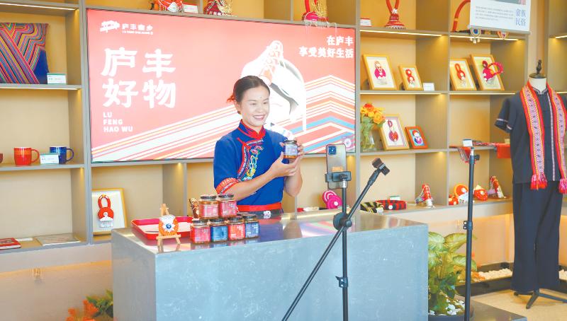 上杭县庐丰畲族乡丰乐村乡村文化会客厅内,商户正在直播带货。龙媒体记者章宸睿摄