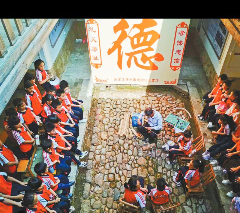永定区抚市镇德文化会客厅内,手艺人向学生们传授花篮子灯技艺。通讯员熊川摄