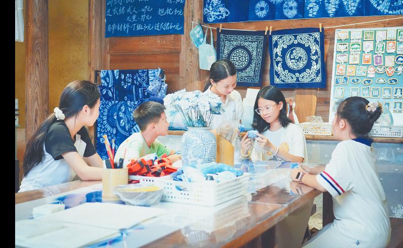 长汀县三洲镇三洲村乡村文化会客厅内,学生正在体验扎染工艺。龙媒体记者章宸睿摄