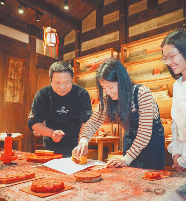 连城县四堡镇雾阁村文化会客厅内,游客正在体验非遗技艺雕版印刷。龙媒体记者章宸睿通讯员江泠钰摄