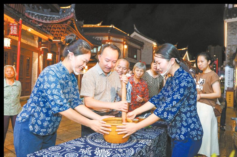 市民在武平县河西社区文化会客厅的兴贤坊传统文化街区体验客家擂茶。龙媒体记者方晨颖摄