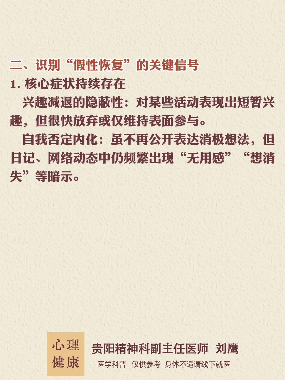 青少年抑郁的“假性恢复”往往反映疾病复杂化,而非真正康复。持续关注情绪、行为及生理指标的整体匹配性(如情绪改善是否伴随功能恢复),结合专业支持,才能避免误判。