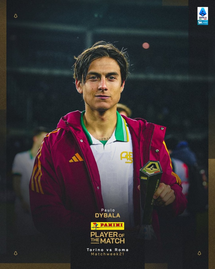直播吧1月19日讯意甲第21轮比赛,罗马在客场以2-0的比分战胜都灵。本场比赛,迪巴拉为客队打进第2球。赛后,迪巴拉被评为本场比赛最佳球员。
