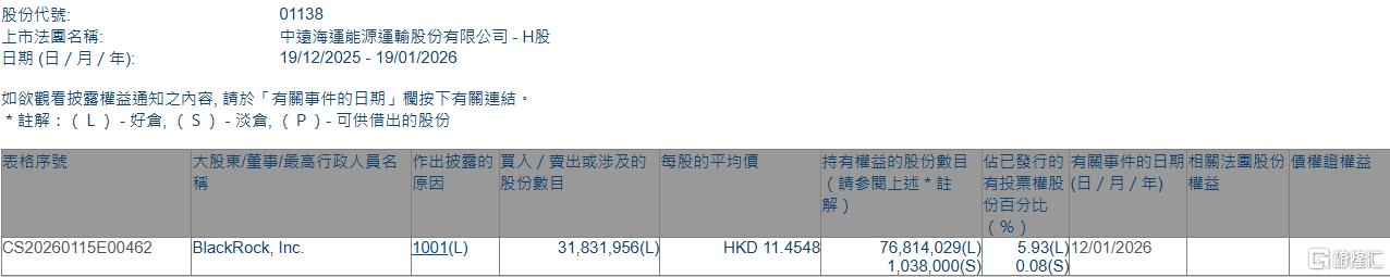 格隆汇1月19日丨根据联交所最新权益披露资料显示,2026年1月12日,中远海能(01138.HK)获BlackRock,Inc.在场内以每股均价11.4548港元增持好仓3183.2万股,涉资约3.65亿港元。