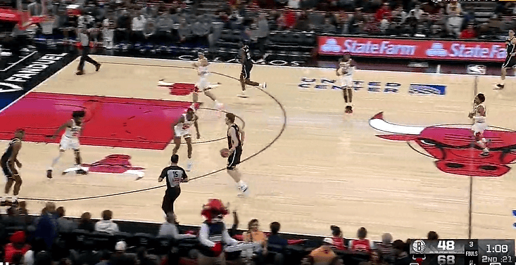 比赛第二节,科比-怀特目前三分5投5中,公牛半场70-51领先篮网。