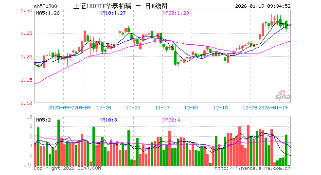 1月19日,上证180ETF华泰柏瑞(530300)开盘涨0.48%,报1.265元。上证180ETF华泰柏瑞(530300)重仓股方面,贵州茅台开盘跌0.01%,紫金矿业涨0.40%,恒瑞医药跌0.23%,药明康德涨0.10%,中国平安跌0.08%,寒武纪跌0.14%,中芯国际涨0.05%,工业富联跌1.41%,招商银行涨0.03%,海光信息涨0.68%。