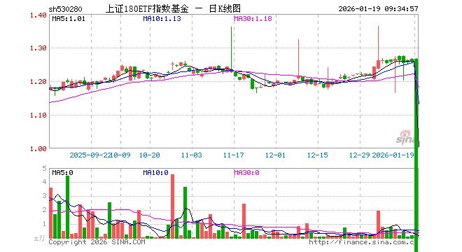 1月19日,上证180ETF指数基金(530280)开盘涨0.56%,报1.265元。上证180ETF指数基金(530280)重仓股方面,贵州茅台开盘跌0.01%,紫金矿业涨0.40%,恒瑞医药跌0.23%,药明康德涨0.10%,中国平安跌0.08%,寒武纪跌0.14%,中芯国际涨0.05%,工业富联跌1.41%,招商银行涨0.03%,海光信息涨0.68%。