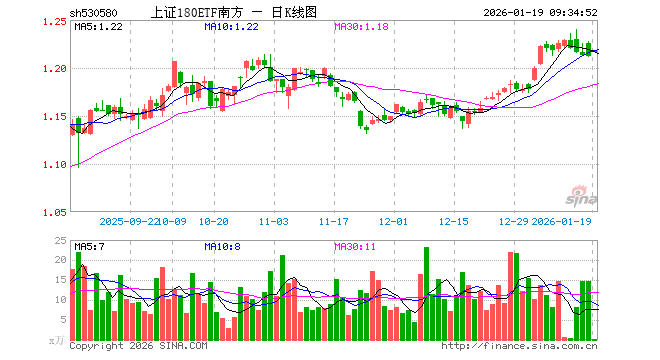 1月19日,上证180ETF南方(530580)开盘涨0.41%,报1.217元。上证180ETF南方(530580)重仓股方面,贵州茅台开盘跌0.01%,紫金矿业涨0.40%,恒瑞医药跌0.23%,药明康德涨0.10%,中国平安跌0.08%,寒武纪跌0.14%,中芯国际涨0.05%,工业富联跌1.41%,招商银行涨0.03%,海光信息涨0.68%。