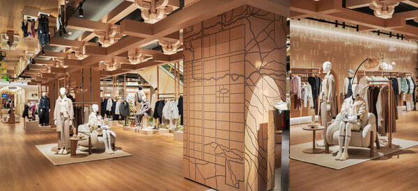 与设计语言相呼应,左侧生活区将FILA生活系列服装与精致的家居氛围摆件进行情境化搭配,让消费者能够在"生活客厅"场景中,从容选购日常生活与社交通勤所需。右侧潮流区则通过一系列模特矩阵,为追逐先锋趋势的年轻人带来引领潮流、彰显鲜明文化态度的穿搭组合。
