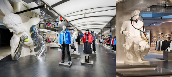 外立面以罗马斗兽场建筑为灵感,沉积岩材质的经典拱门结构象征罗马文明的深厚底蕴,也叙说着品牌的意大利基因。门口伫立的巨型雕塑以《掷铁饼者》对竞技瞬间的经典定格为灵感,与店内取意自《朱利亚诺•德•美第奇像》、身披FILA经典网球单品BB1大满贯POLO的另一座雕塑遥相呼应——一个手掷网球,一个手持球拍,共同演绎《网球新章》主题。品牌基因中源自古罗马竞技文化的力量感与秩序美,在当代运动语境中得以延续。