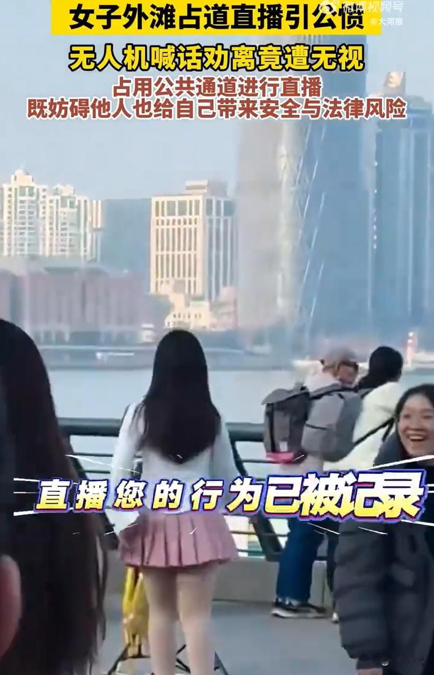 无知者无畏!上海,一女子穿着短裙在外滩搔首弄姿直播引起公愤,不仅现场的游客觉得反感,就连警用无人机都上前喊话提醒,可女子就跟没听见一样,依然我行我素,完全无视 视频中,一位年轻女子穿着清凉短裙,在人行道中央架起手机支架,开始旁若无人地跳舞直播。她的穿着与周围裹着外套的游客形成鲜明对比,动作幅度不小,引得路过行人纷纷侧目。有人加快脚步绕开,有人尴尬地笑笑,也有带孩子的大人连忙将孩子视线挡开 这还不是最引人注目的。没过多久,一架警用无人机飞到女子上空,发出清晰提醒:外滩区域禁止占道直播,您的行为已被记录,请立即离开。声音透过无人机扬声器传出,周围不少游客都抬头观看 但令人意外的是,女子只是抬头看了一眼,便继续对着手机镜头跳舞,仿佛什么都没听到。她时不时与直播间观众互动,完全沉浸在自己的世界里,对无人机的警告置若罔闻 对此,支持管理的观点认为,公共场所是大家共享的,个人的直播自由不能建立在影响他人、妨碍公共秩序的基础上。穿什么虽是个人自由,但在公共场所过度暴露、做出引人侧目的行为,实际上是对他人视觉上的强迫 另一种声音则认为,只要不违法,人们应该有在公共场所表达自我的自由 对于后一种观点,我个人并不认同,如果每个人都可以在公共场合随意进行直播、跳舞或者其他引人注意的行为,那么公共场所就会变得混乱不堪,尤其是在人流密集的地方。这样的自由虽然是个人的,但却会影响到他人的视觉感受,甚至妨碍他人正常的行为和休息 这并不是要剥夺每个人表达自己的机会,只是希望大家能在合适的场合、合适的方式下表达自己。我们有无数的社交平台、私密空间,可以尽情展示自我。而公共场所的功能,不是展示自我的舞台,而是供人交流、休闲和活动的地方