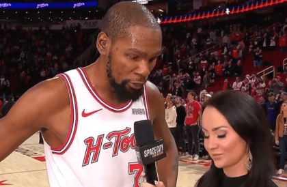 虎扑01月19日讯NBA常规赛,火箭119-110战胜鹈鹕,赛后,凯文-杜兰特接受了采访,谈到了生涯总得分超越德克-诺维茨基升至历史得分榜第六位。