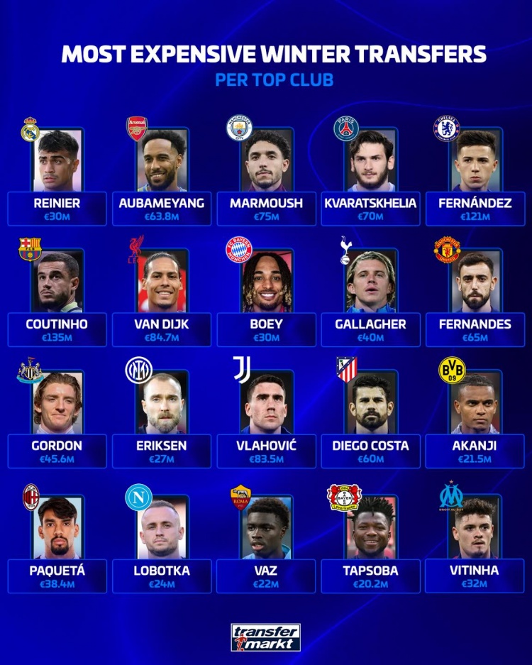 直播吧1月19日讯德国转会市场盘点了各大俱乐部冬窗的最贵引援,切尔西1.21亿欧引进恩佐、巴萨1.35亿欧引进库蒂尼奥在列。