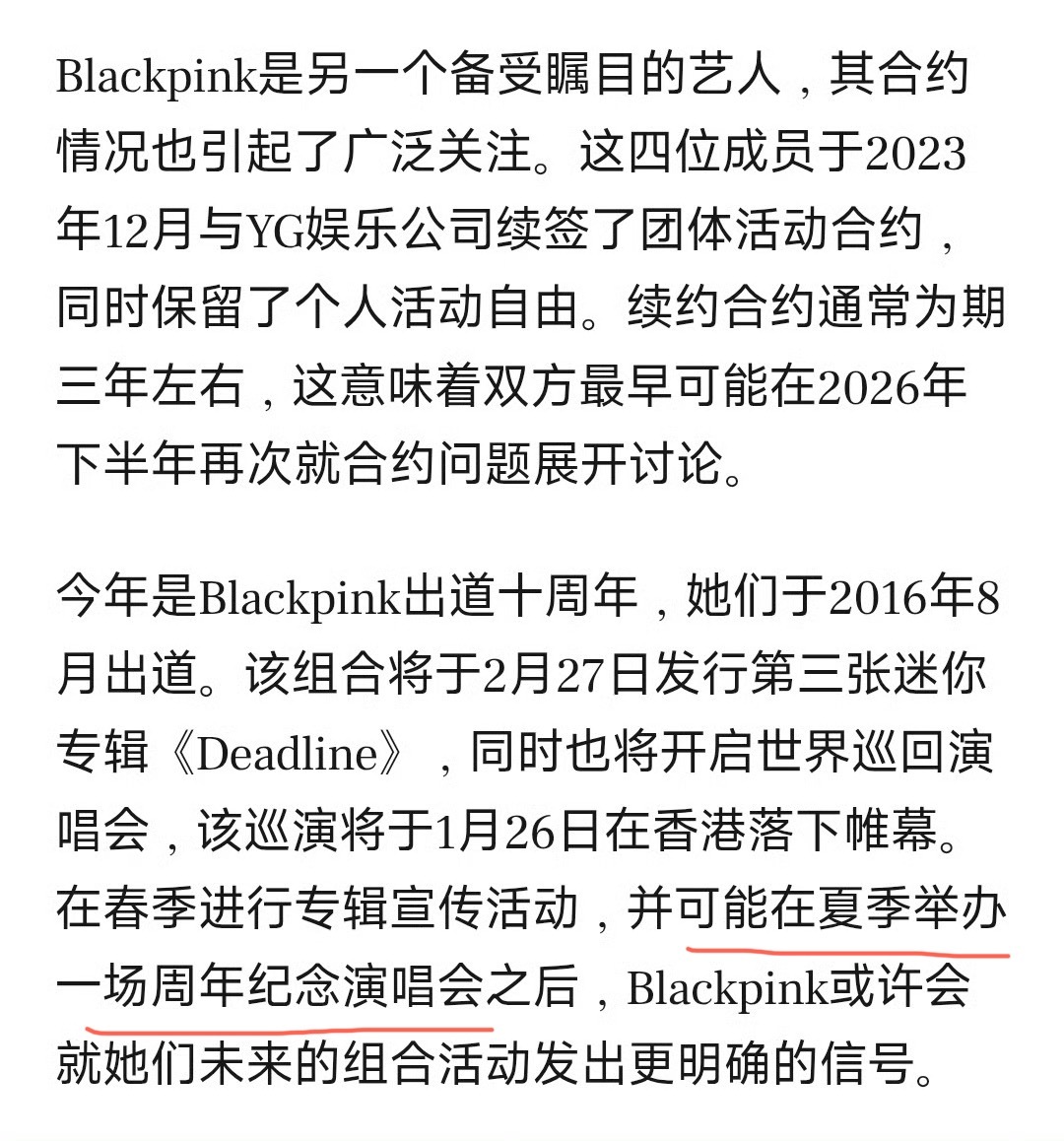 BLACKPINK或将举办十周年演唱会 今年是BLACKPINK出道十周年,2016年8月组合出道。该组合将于2月27日发行第三张迷你专辑《Deadline》,同时也将开启世界巡演,该巡演将于1月26日在香港落下帷幕。在春季进行专辑宣传活动,并可能在夏季举办一场周年纪念演唱会🎶