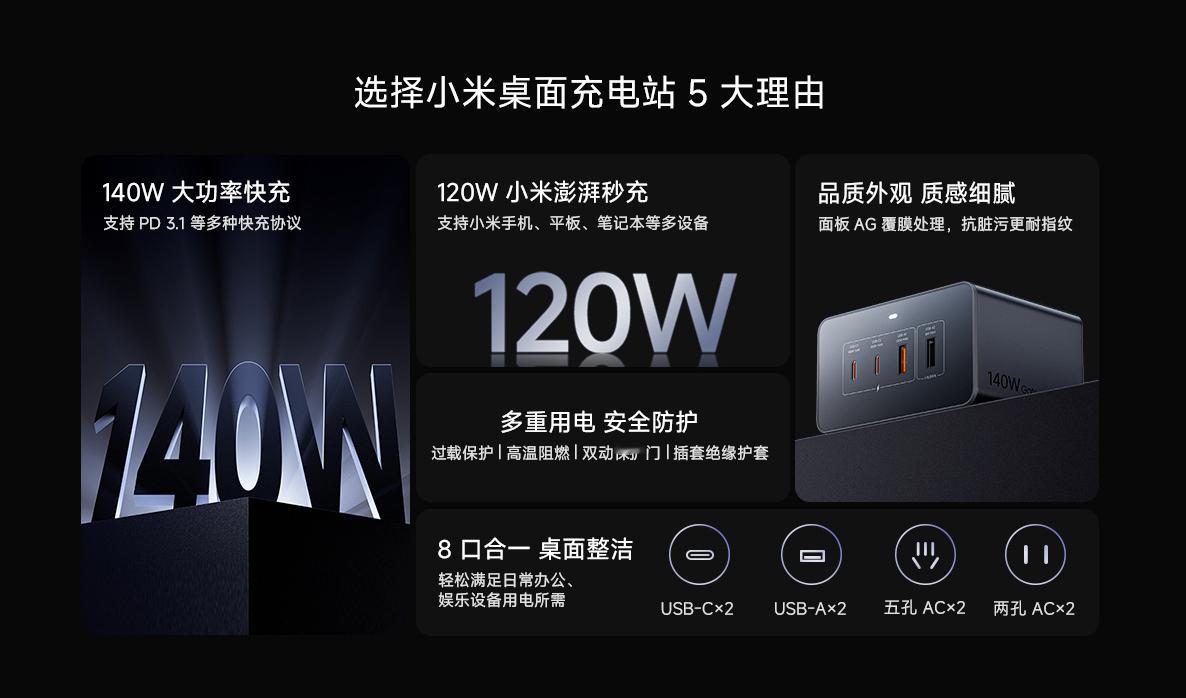 小米首款140W桌面充电站今日开售,仅269元!8口合一(2×USB-C、2×USB-A、2×五孔AC、2×两孔AC),总功率高达2500W。双C口盲插任一均支持140W快充,兼容小米120W及主流品牌手机、笔记本,包括苹果、华为、戴尔等。内置智能功率芯片,多设备接入自动分配,小电流口专为耳机/手表优化。全协议支持PD3.1、QC4+、PPS、SCP等,一“站”解决桌面充电焦虑!