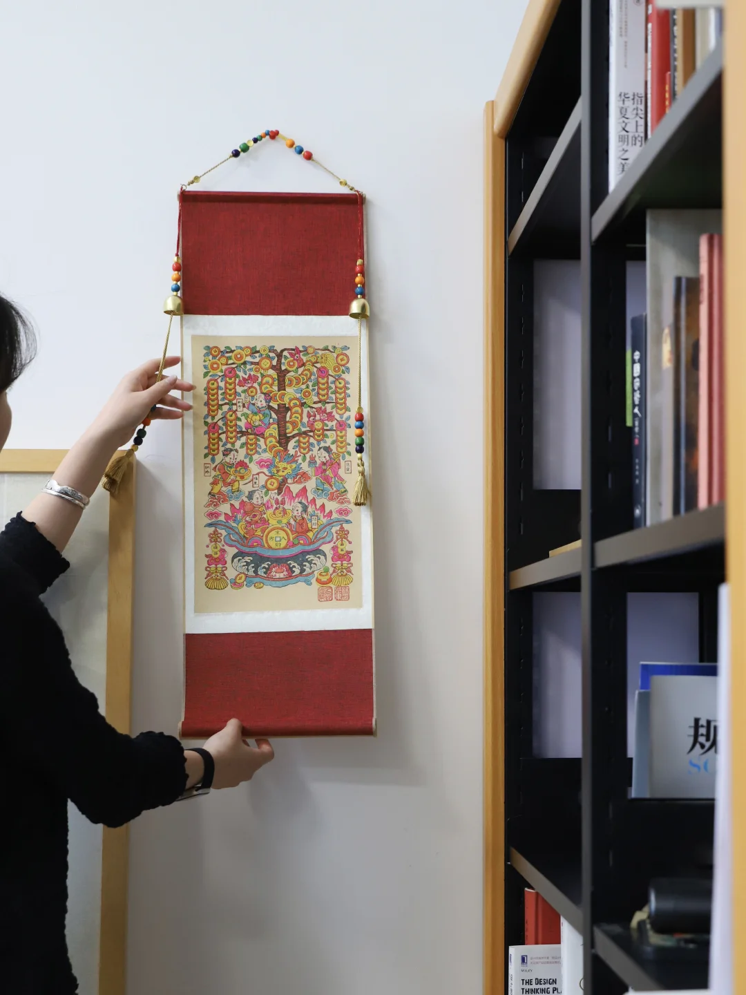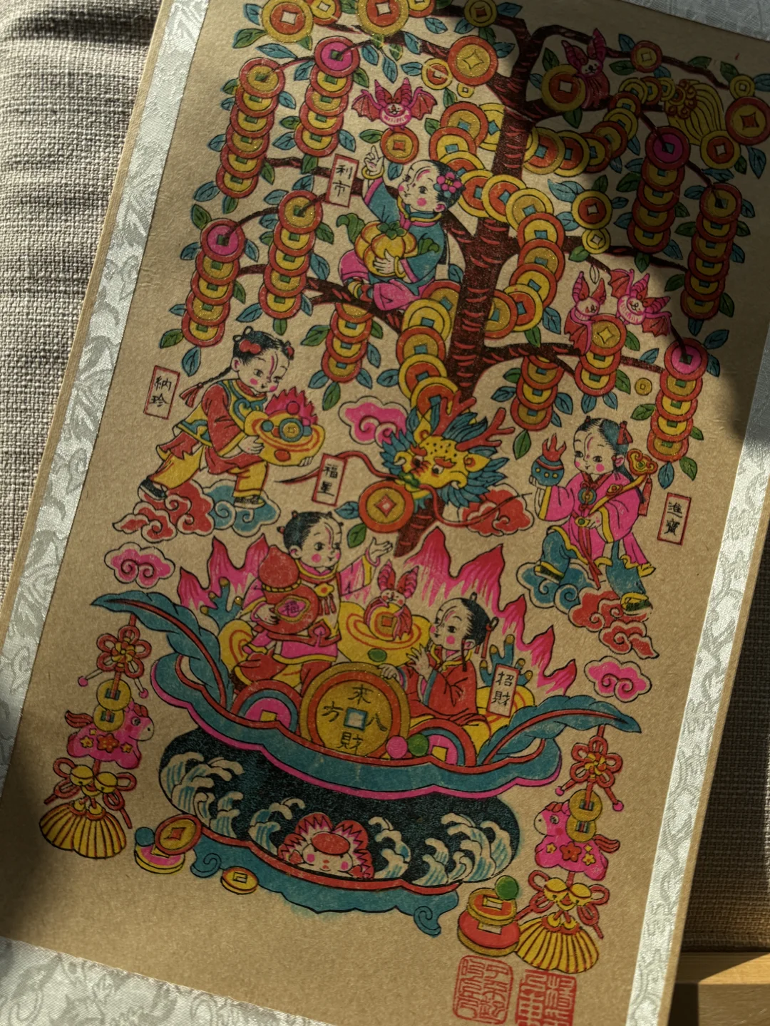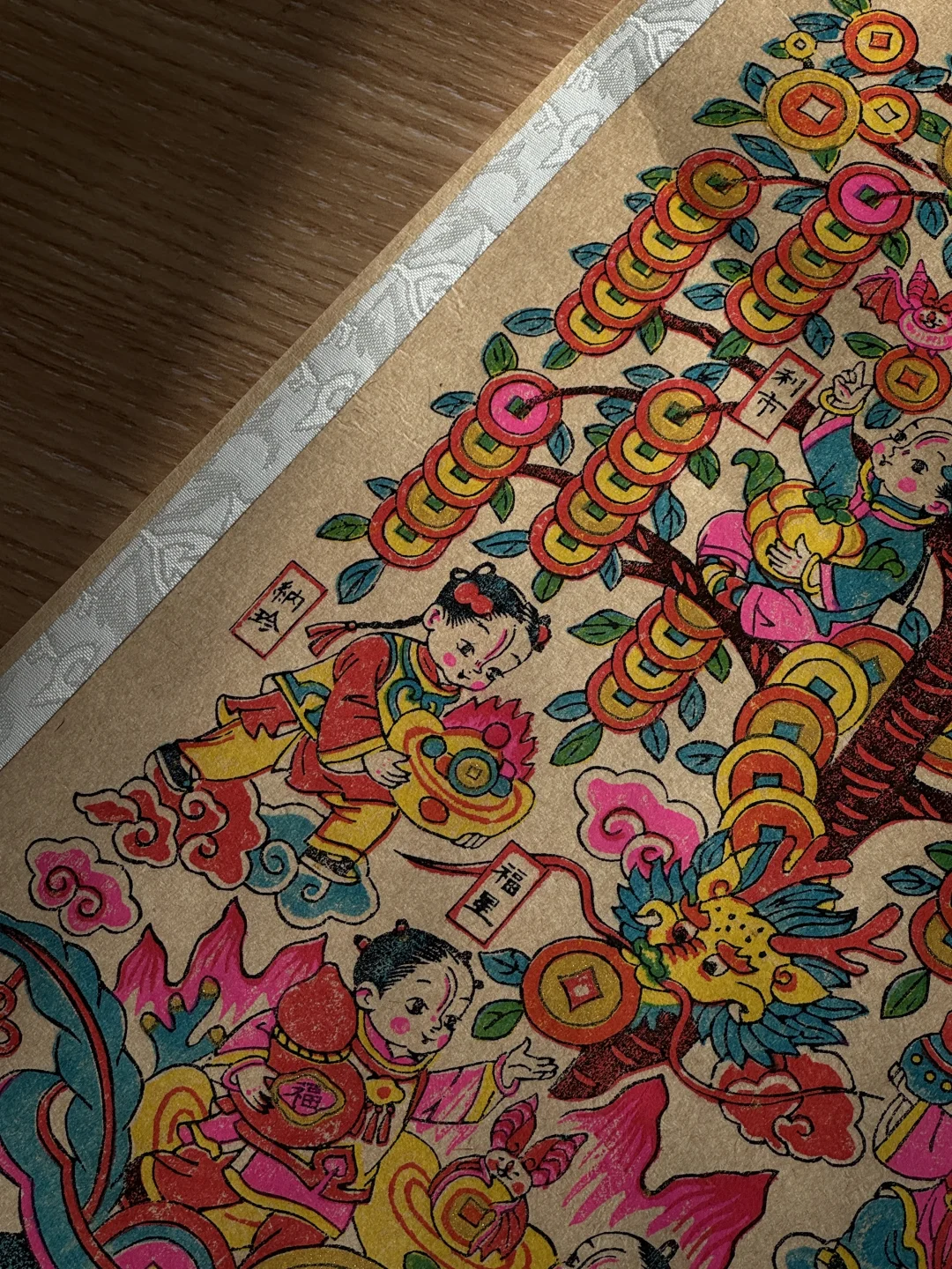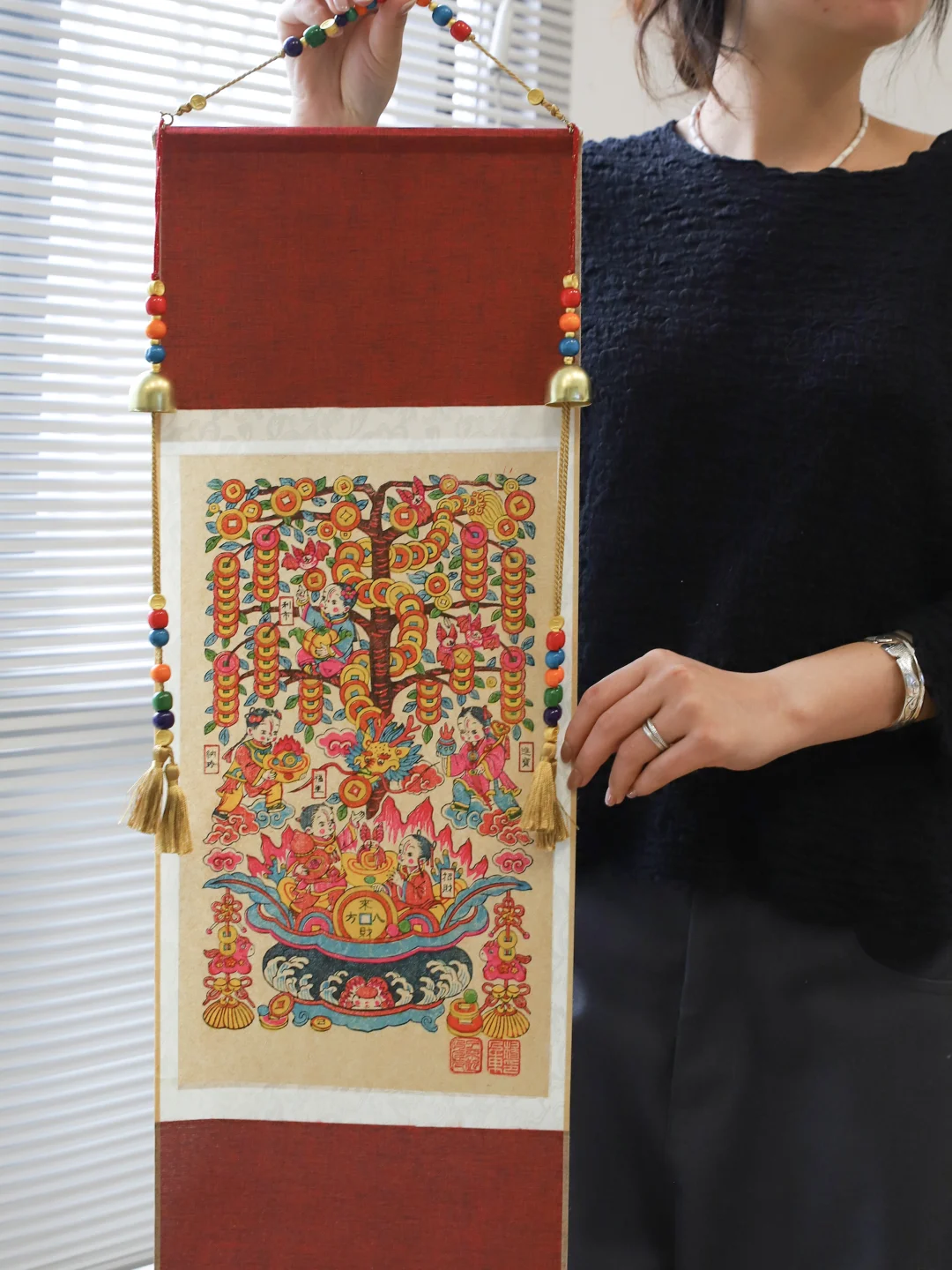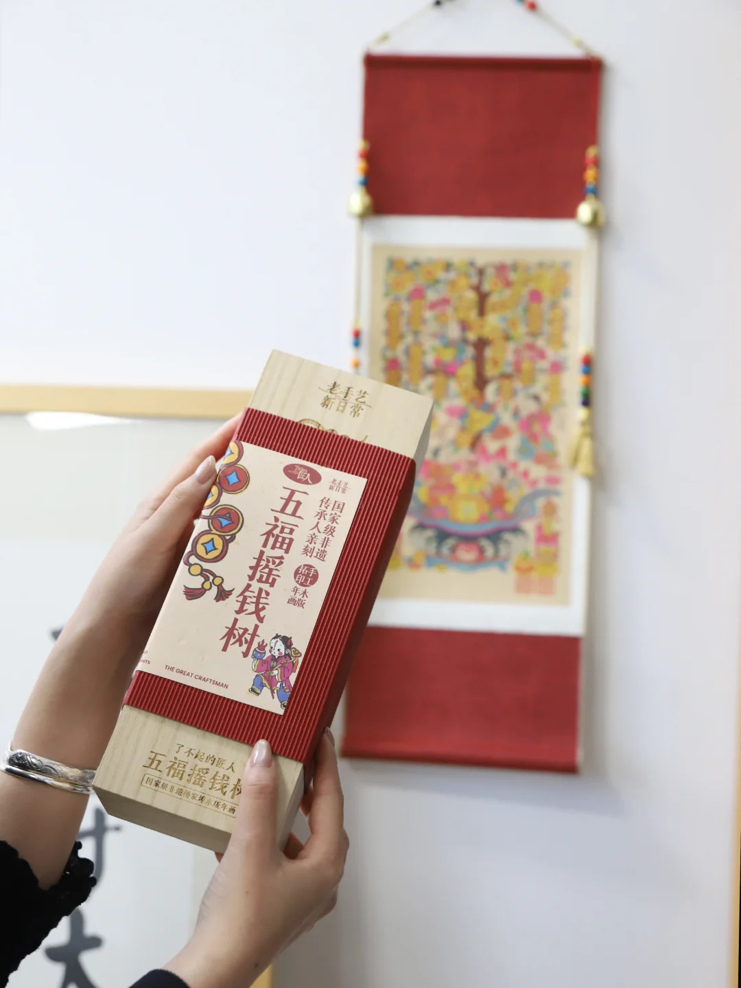首张加入年轻设计师的年画 光刻板就花了三个月时间 在2025年底给出了答案 很多人说年画丑 我们加入年轻的视角 拥有民俗感的同时 有现代卡通的风格 适配日常家居 不一定只在过年挂 第二我们把年画做成了卷轴的形式 无需装裱就可以适配家居 对送礼的朋友也很友好 新年不只想着送零食 上门送年画更有记忆点~ 五福摇钱树寓意五福临门 好运自然来! 2026红红火火~