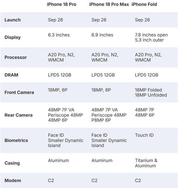 苹果iPhone发布节奏大改!从iPhone 18系列起,一年两更:2026年秋季首发三款——iPhone 18 Pro(6.3英寸)、18 Pro Max(6.9英寸) 和 首款折叠屏 iPhone Fold(7.8英寸内屏+5.3英寸外屏);基础款 iPhone 18 / 18e 则推迟至2027年春季 上市。全系搭载 A20 Pro芯片 + 12GB内存,Pro系列保留 Face ID,Fold则采用 侧边指纹 + 屏下前摄。影像方面,Pro系列为 4800万三摄 + 1800万前摄,Fold后置双4800万镜头,内外前摄均为1800万像素。全系弃用高通基带,首发苹果自研C2基带芯片,标志着苹果在通信自主化上迈出关键一步。这或将成为史上升级幅度最大的iPhone一代。