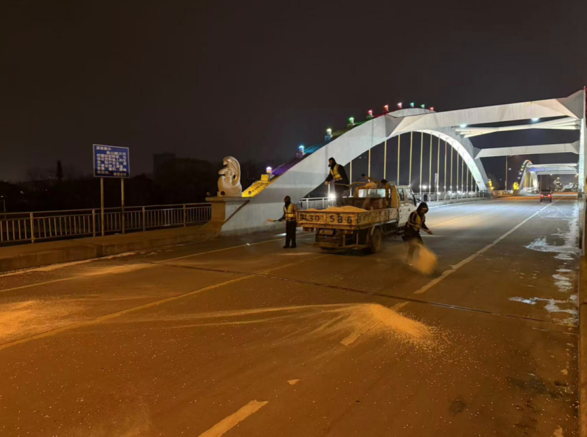 1月19日凌晨5时,该市市政部门及时开展桥涵清冰融冰作业,依次对市区交通路沙河桥、嵩山路沙河桥等市区13座桥梁和5座立交涵洞持续精准高效抛洒融雪剂。针对泰山路沙河桥机动车无法通行实际,工人对该桥路面进行人工抛洒融雪剂,早高峰前已完成市区桥涵融雪剂抛洒作业。截至当日11时,已累计抛洒融雪剂60余吨,出动设备40余台次,人员200余人次,市区桥涵路面无结冰,市民通行安全顺畅。