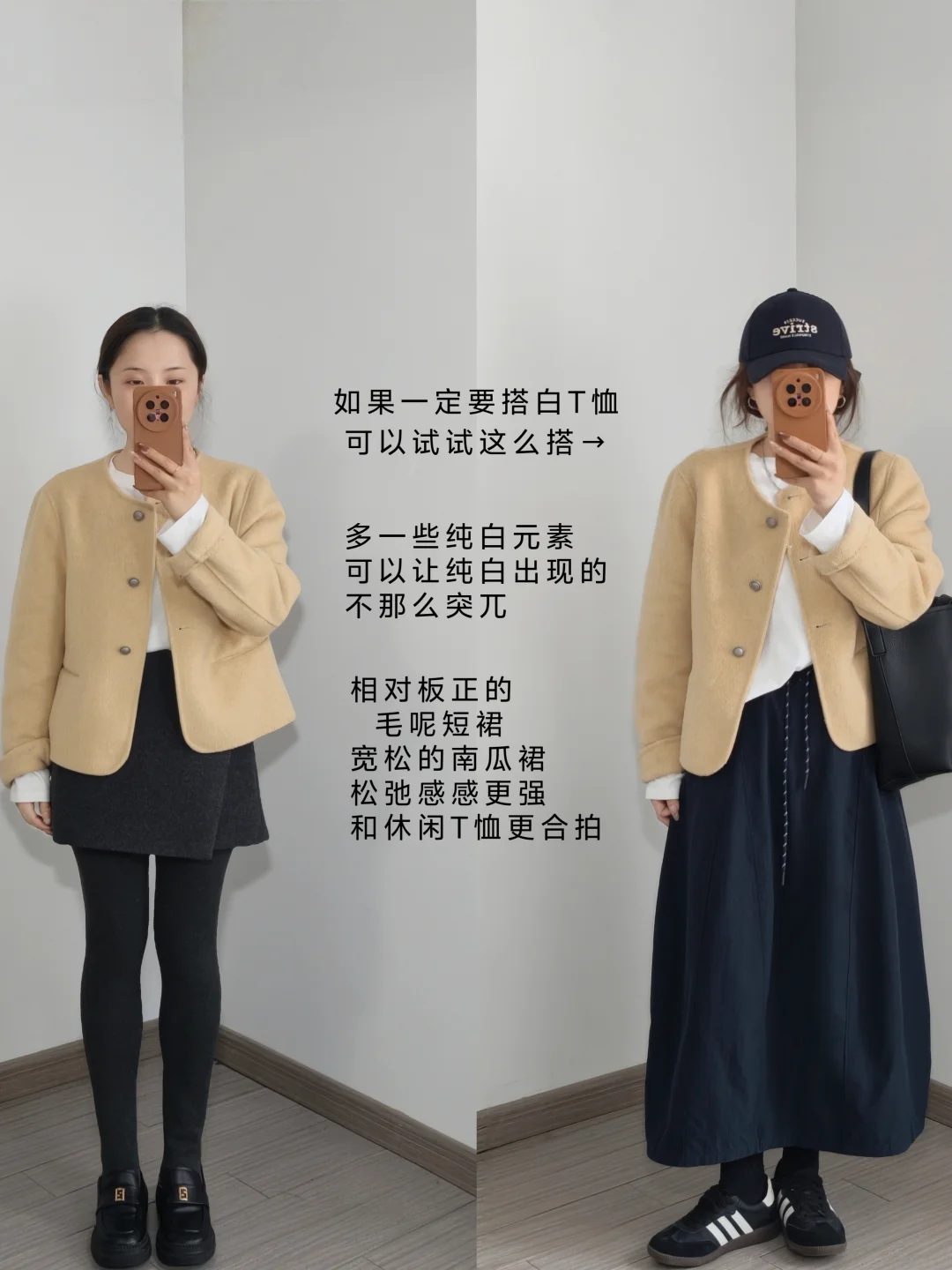 白色短款毛衣搭配毛绒短裙,优雅又俏皮,完美展现时尚感!
