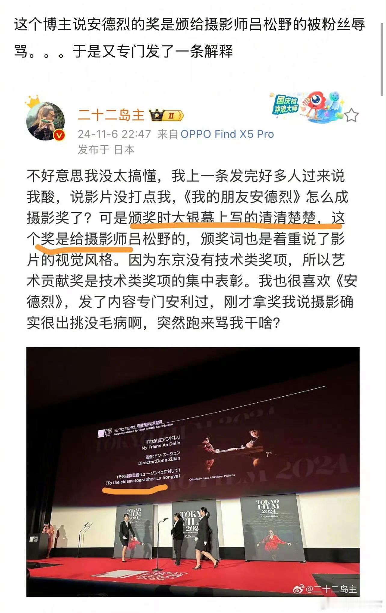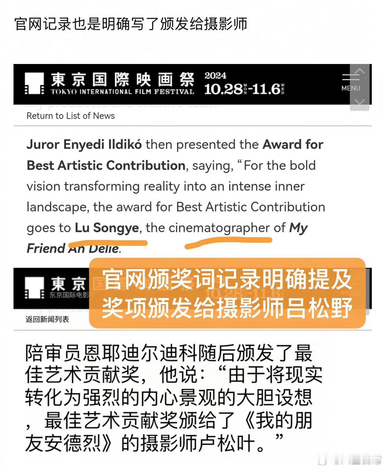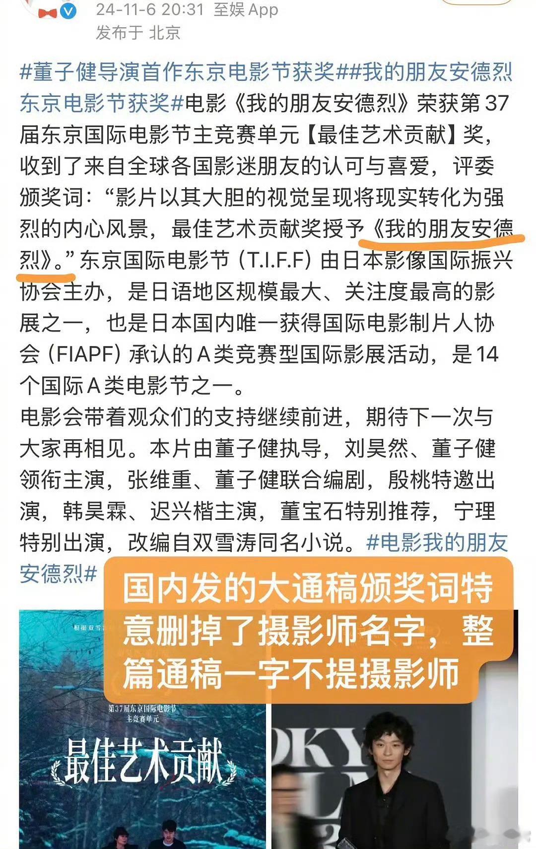 还有这么一出呢?之前《我的朋友安德烈》在东京电影节获得最佳艺术贡献奖,这个奖是颁给摄影师吕松野的,但电影在国内发的大通稿只字未提摄影师
