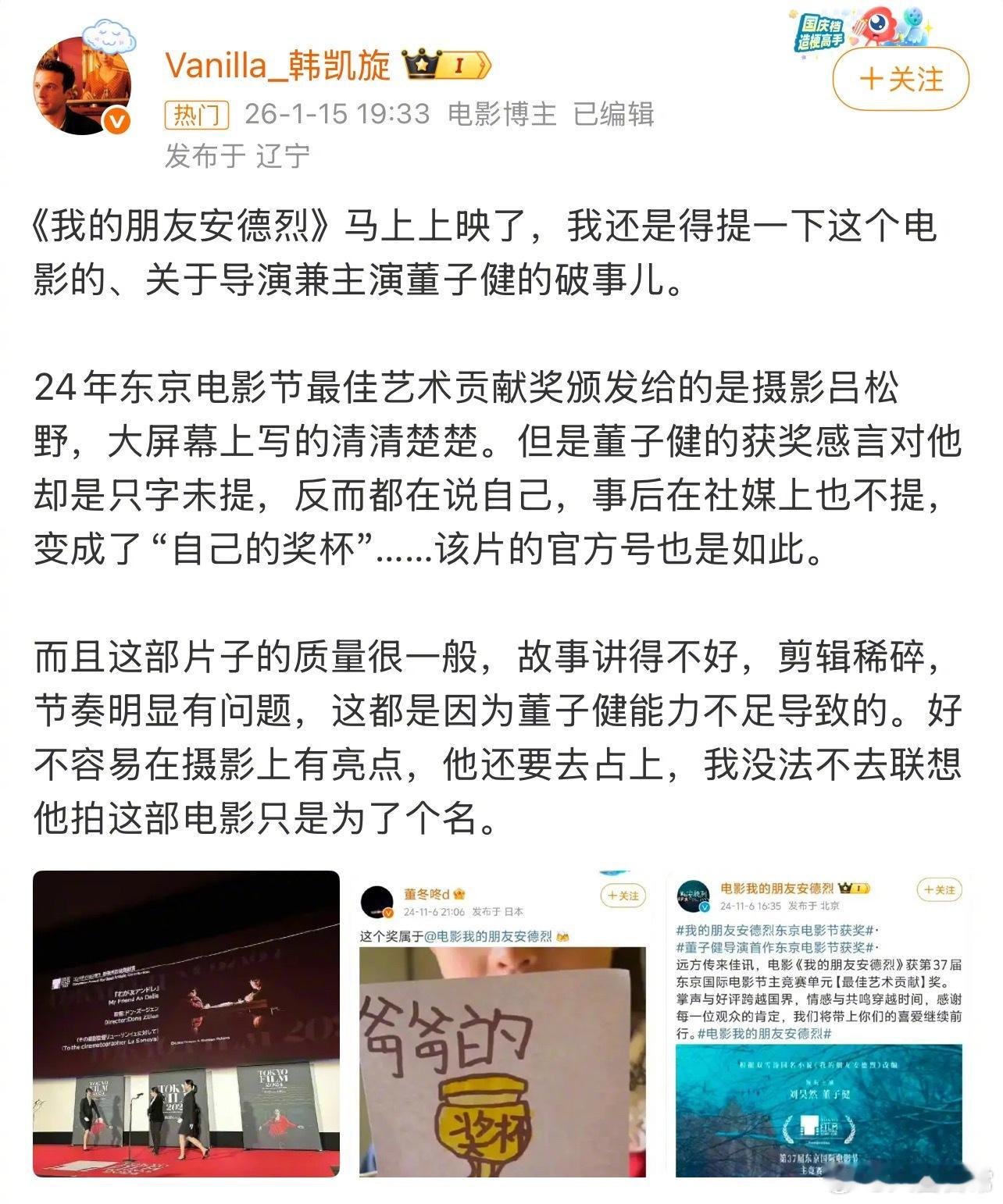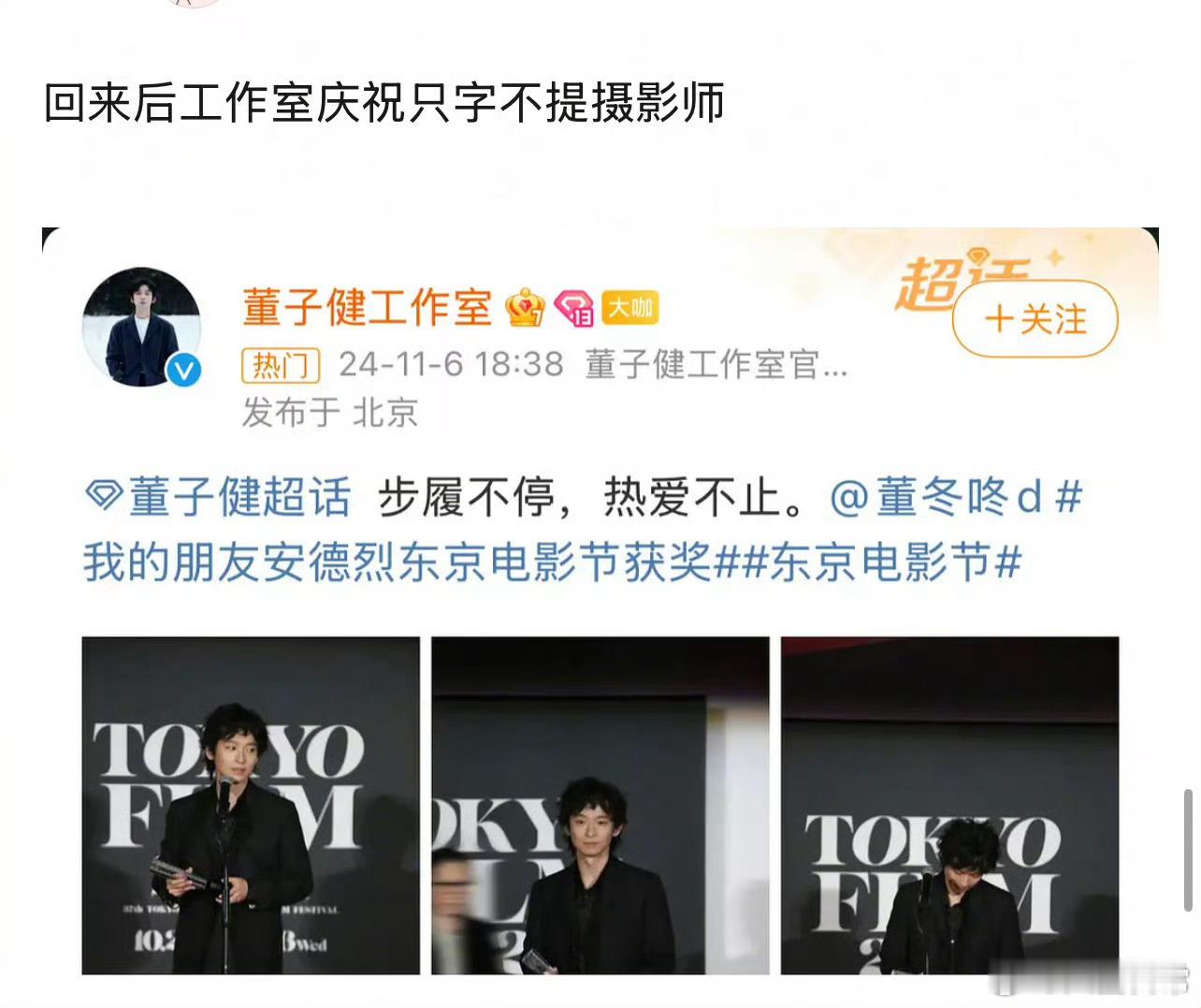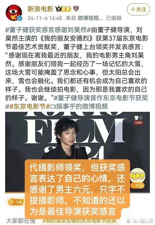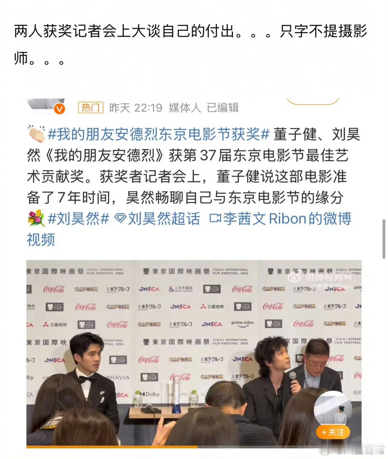 还有这么一出呢?之前《我的朋友安德烈》在东京电影节获得最佳艺术贡献奖,这个奖是颁给摄影师吕松野的,但电影在国内发的大通稿只字未提摄影师