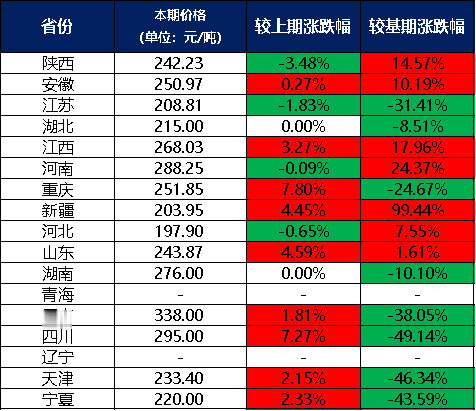分价格区间来看,本期两碱工业盐单价在300元/吨及以上的地区有1个,为云南;两碱工业盐单价在300元/吨以下的地区有14个,分别是陕西、安徽、江苏、湖北、江西、河南、重庆、新疆、河北、山东、湖南、四川、天津、宁夏。