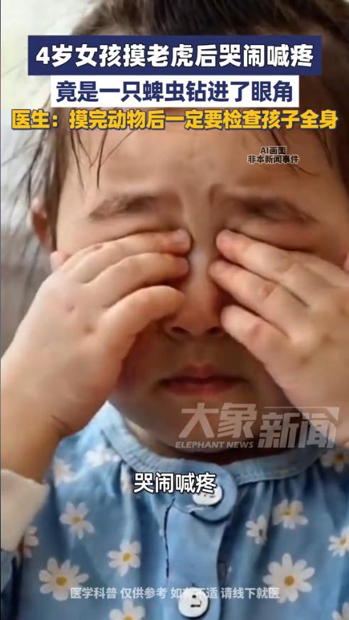“太可怕了!”近日,河南郑州,一4岁女孩在动物园时摸了小老虎没想到回家后就开始哭闹喊疼,还一直揉眼睛,家长起初以为是被老虎抓伤,但仔细检查后也没有发现伤口,于是便带孩子到医院就诊。网友:被老虎吓着了? 很多动物园都设有动物互动区,让孩子近距离接触萌宠猛兽,这本是充满乐趣的亲子体验,可谁能想到,看似温顺的动物身上,竟藏着这样的“隐形杀手”。 据媒体1月16日报道,当天,女孩和家人在动物园游玩,在猛兽互动区时女孩近距离接触了老虎,很是开心。可回家后不久,就开始哭闹,一直揉眼睛,说眼角又疼又痒。家长检查后没发现外伤,还以为是孩子揉眼睛揉的,但孩子始终哭闹不止,为了安全家长带她去医院检查。 医生在裂隙灯下检查时,竟在孩子的眼角结膜处发现了一只正在蠕动的活蜱虫!随后医生用镊子小心翼翼地将蜱虫完整取出,而后进行了消毒处理,而取出的蜱虫因吸血已经有指甲盖大小了。 医生提醒,蜱虫常附着在动物皮毛上,尤其是野外或动物园的动物身上更容易携带。孩子皮肤娇嫩、抵抗力弱,摸完动物后如果不及时检查,蜱虫就可能爬到身上甚至钻进皮肤、黏膜处。 由此可见,带孩子接触动物后,一定要仔细检查全身皮肤,尤其是耳后、颈部、眼角等隐蔽部位,一旦发现蜱虫附着,不要硬拔,要及时就医处理。 信息来源:《1月16日报道,4岁女孩摸老虎后哭闹喊疼,竟是一只蜱虫钻进了眼角!大象主播说 河南都知道 》大象新闻
