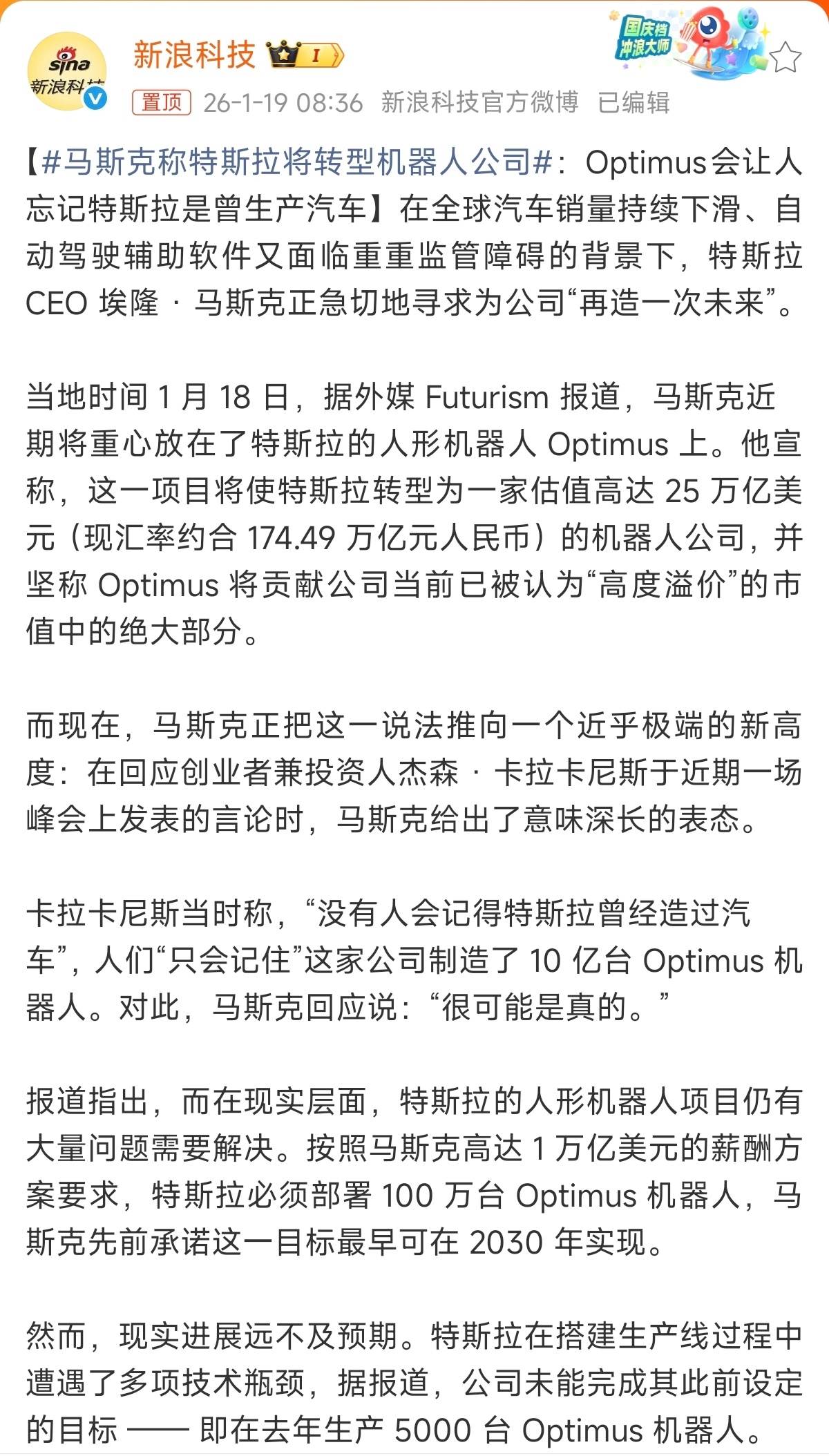 马斯克称特斯拉将转型机器人公司没人会记得特斯拉造过汽车,但人们只会记住这家公司制造了 10 亿台 Optimus 机器人!特斯拉计划最快于2030年制造100万台机器人,5年后100万台,太魔幻了,如果计划成真,无人化进度会比想象的还快!当然,加上中国的,可能就是千万级别的人形机器人诞生,就问你准备好了吗?