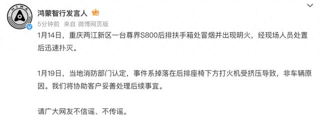 鸿蒙智行回应“重庆一台尊界S800起火”:系掉落在后座的打火机受挤压导致,非车辆原因