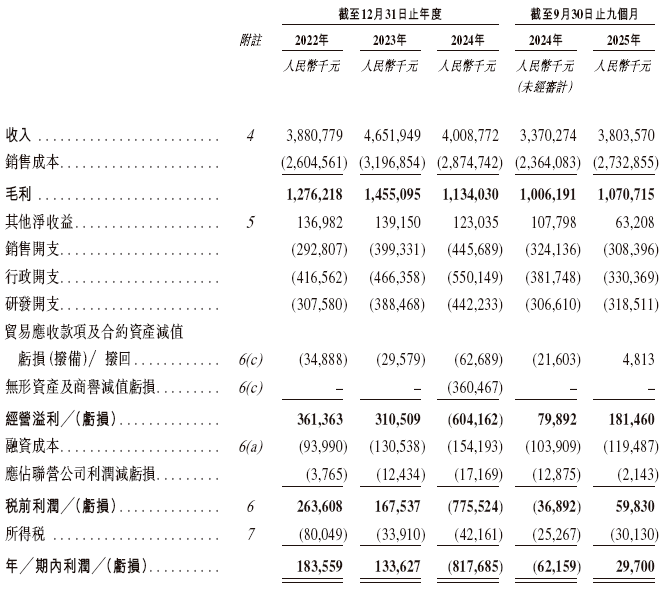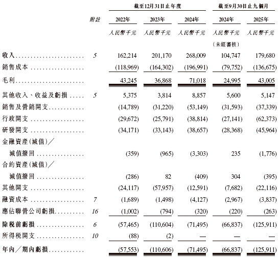从财务数据来看,翼菲智能近年营收呈稳步增长态势:2022年营收1.62亿元,2023年增至2.01亿元,2024年进一步攀升至2.68亿元,2025年前九个月也收获了1.80亿元的营收。但与之相对的是,企业仍未摆脱亏损局面,同期净亏损分别为0.58亿元、1.11亿元、0.71亿元和1.26亿元;经调整后净亏损分别达到5280万元、1.06亿元、5230万元及7820万元。