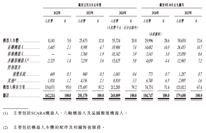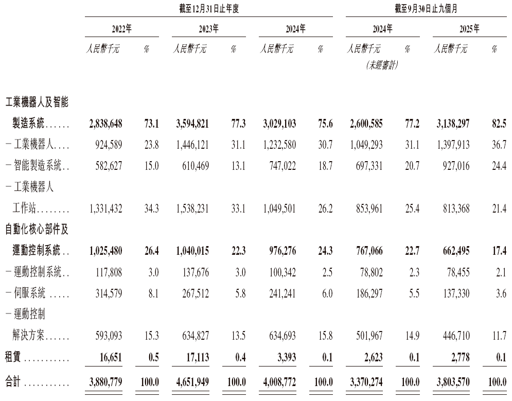 作为核心板块之一工业机器人及智能制造系统,2022-2024年,该板块收入在为28.38,648千元、3,594,821千元、3,029,103千元;2025年前九个月,该业务收入达3,138,297千元,收入占比进一步提升。