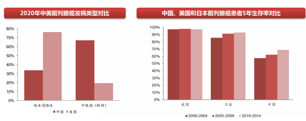 居高不下的发病率下,是我国前列腺癌患者较低的早期检出率以及5年生存率。《前列腺癌筛查中国专家共识》及柳叶刀数据显示,我国仅有3成的前列腺癌在早期发现,初诊时多数患者已处于中晚期,这也导致我国前列腺癌患者的5年生存率显著低于美国及日本。