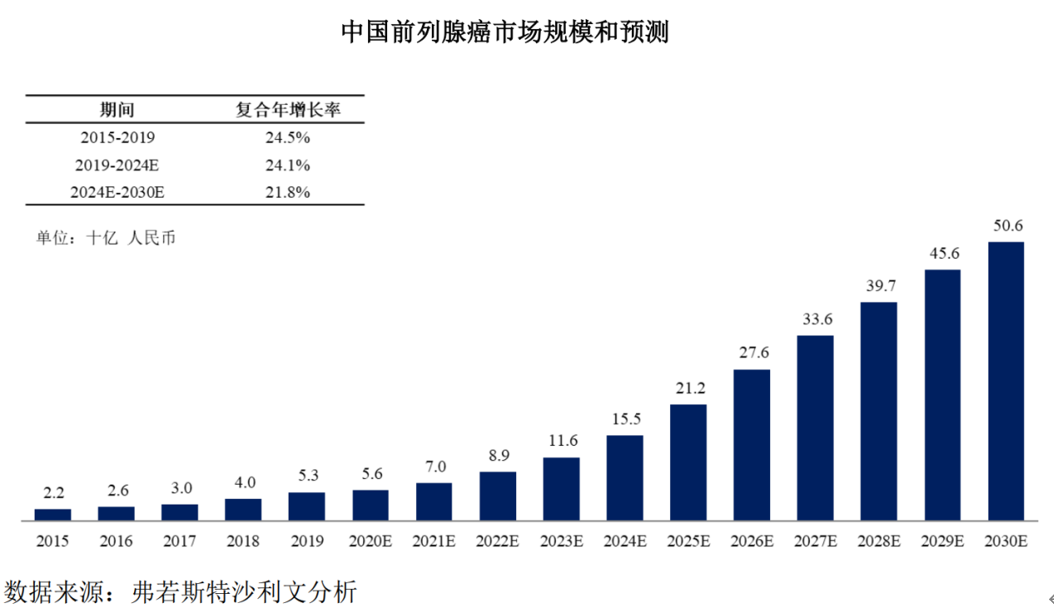 前列腺癌是我国男性群体中常见的癌症类型之一,且其发病率和病死率正随着人口老龄化加剧等因素呈明显升高趋势。根据弗若斯特沙利文数据,2030年中国前列腺癌新发病例数将达到近20万人,其药物市场规模也将以约21.8%的复合年均增长率增长至近506亿元人民币。