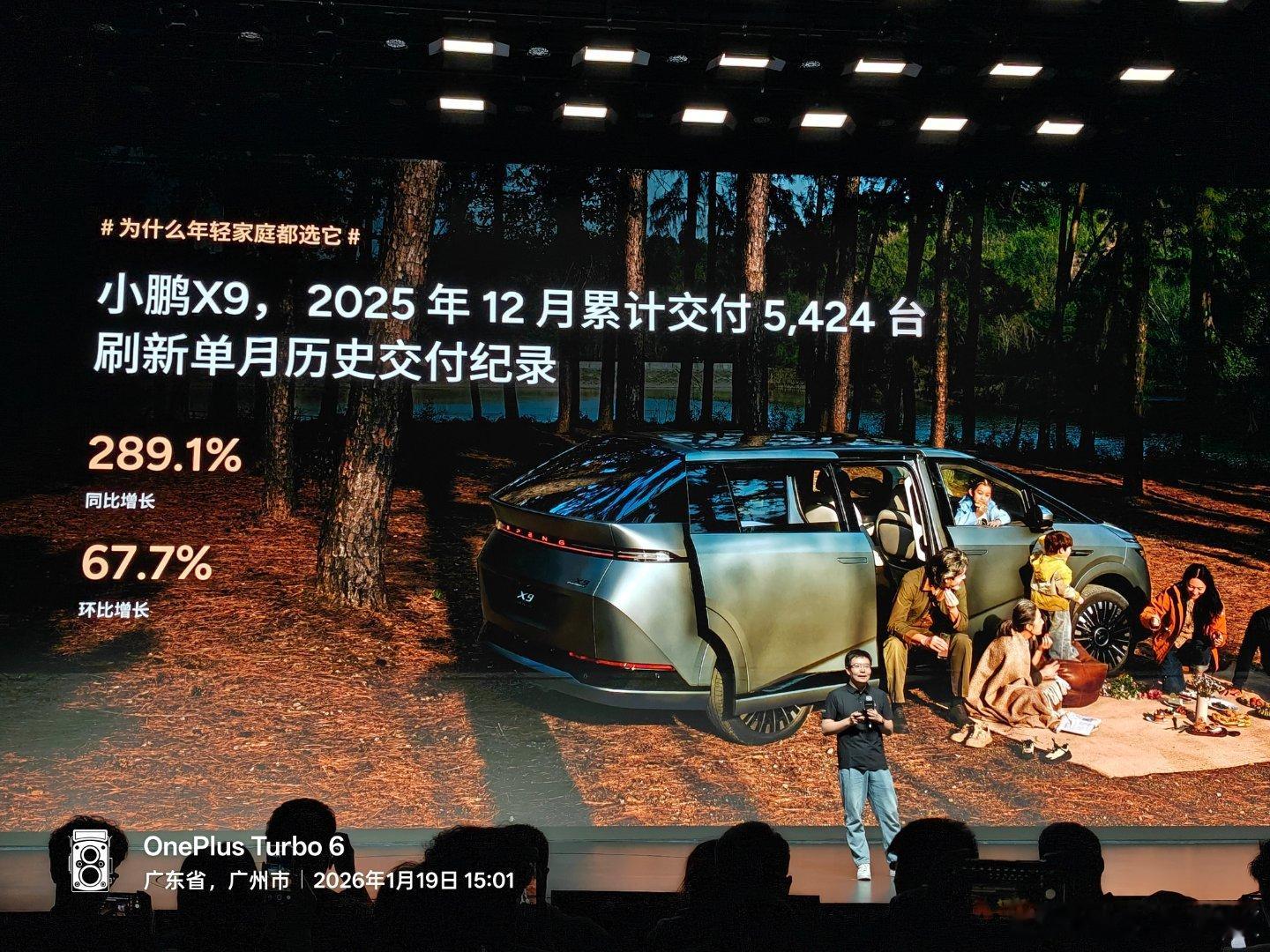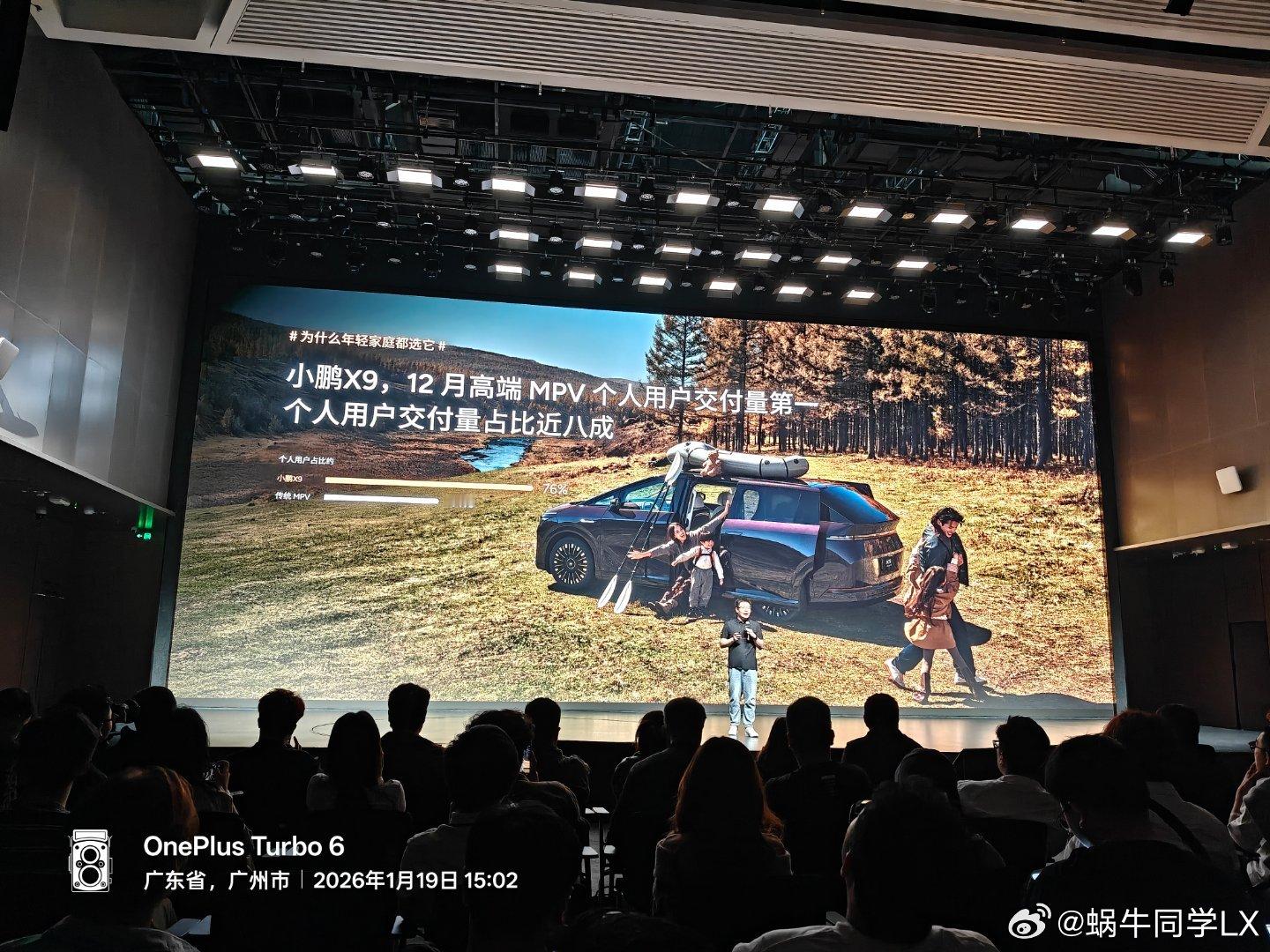 闪现广州,打卡小鹏X9超级增程用户画像分享交流会。一直以来MPV主要用于商务出行,小鹏X9的出现,越来越多家庭用户加入到MPV车主行列。小鹏汽车产品经理于桐分享了不少亮眼数据,摘抄几个分享给大家:1、2026年12月,小鹏X9交付5424台,同比增长289.1%,环比增长67.7%,单月交付创历史新高;2、小鹏X9的个人用户占比达八成,远高于传统MPV;3、小鹏X9是2025年下半年香港地区MPV销量冠军;4、小鹏X9超级增程首购比例高达21%,远高于行业平均水平;5、小鹏X9超级增程90后用户占比57.2%,00后占比13.7%,名副其实的年轻家庭第一台大车;6、小鹏X9超级增程女性车主占比22%,后轮转向+前双叉臂、后H臂全铝悬架底盘,还有双腔空气弹簧,6D防晕车算法,让车更好开;7、小鹏X9改装贴膜比高达36.8%;8、小鹏X9超级增程在北方核心城市销量增幅超300%,1602km综合续航,452km纯电续航,92.3%用户用于城际出行,81.6%用户单日行驶超500km,成为城际出行的第三种选择。小鹏X9超级增程星舰2.0设计拒绝油腻“老登”形象,捕获年轻人喜爱,成为年轻家庭的第一台大车。同时,X9凭借时尚前卫的星舰造型,成为时尚圈的新晋潮流单品,相继成为科技、时尚潮牌活动官方用车。老实说,开MPV最尴尬的就是别人以为你是专职司机,小鹏X9把这种误解几乎降为零。小鹏X9超级增程首个用户画像报告发布小鹏X9年轻家庭的第一台MPV