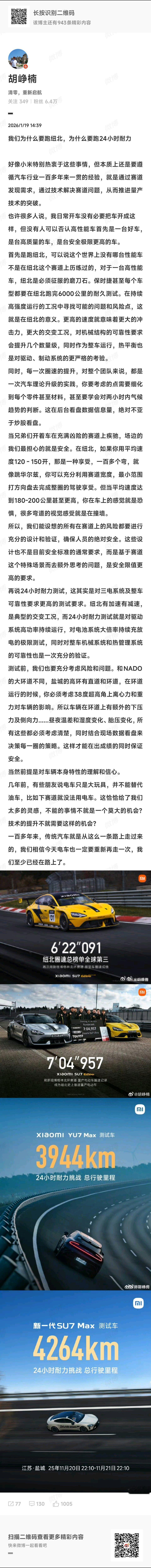 小米为什么热衷于跑纽北?来自专业人士,官方人员的答案:通过极端工况验证车辆可靠性、热管理等性能,推进量产技术突破。高性能车是好车、安全极限更高的车。小米SU7刷新纽北量产电动车圈速纪录(全球第三),新一代SU7 Max测试车在盐城完成24小时4264km耐力挑战,回应了“电车不能下赛道”的质疑。