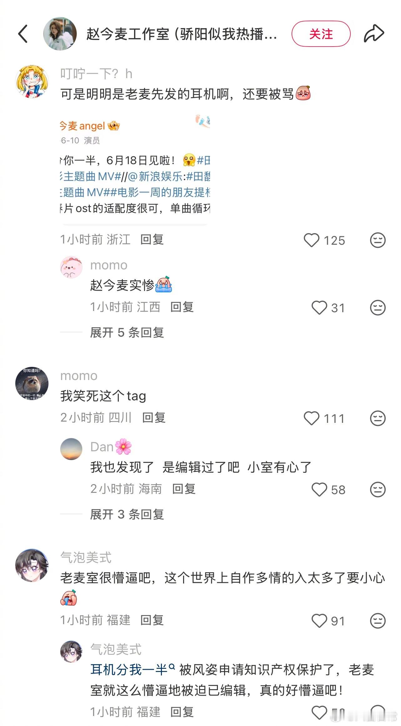 赵今麦工作室发图配文“耳机能不能分我一半”被说在硬cue张凌赫,但粉丝指出赵今麦几年前就发过类似的文案。现在赵今麦工作室已经把文案改了