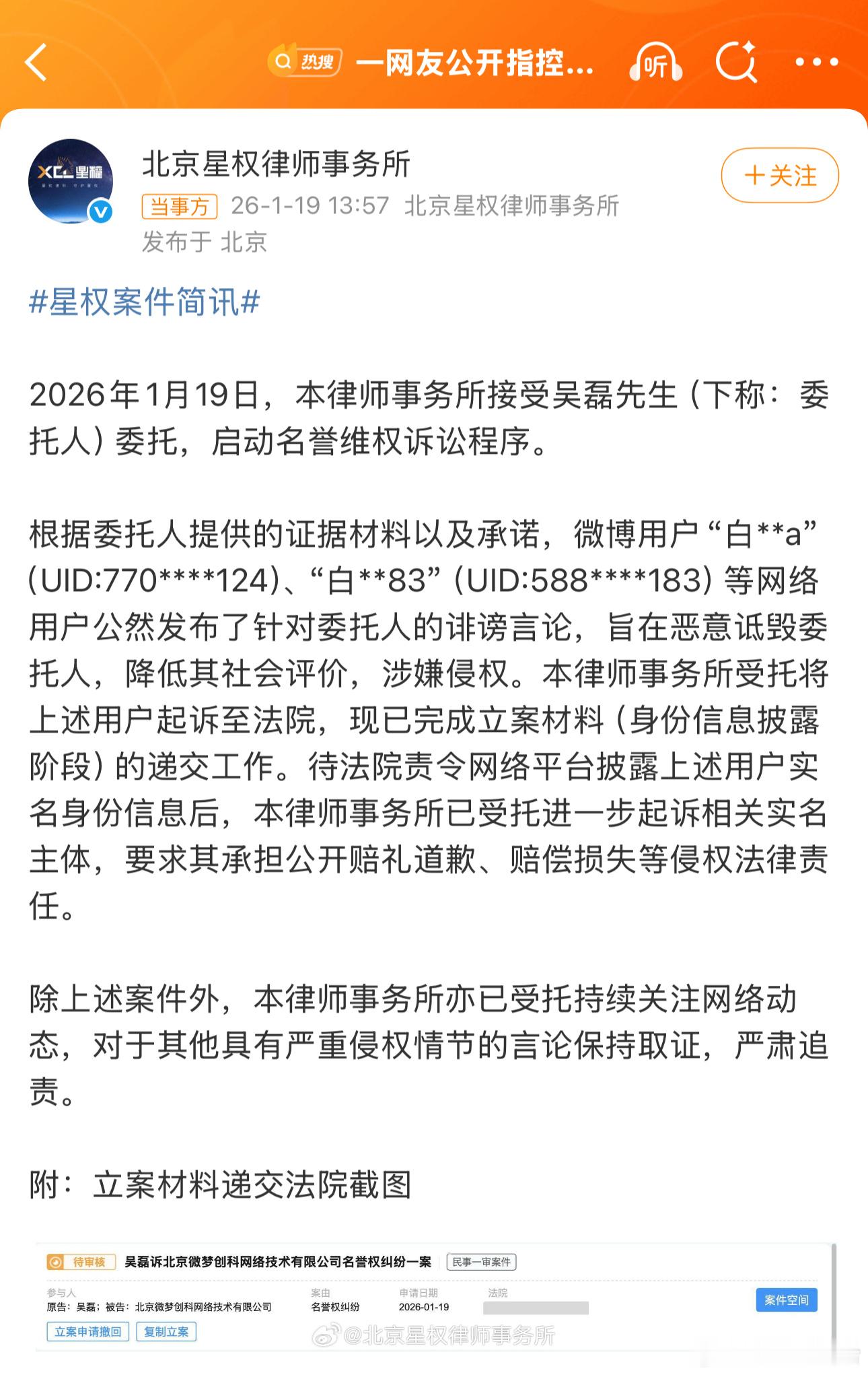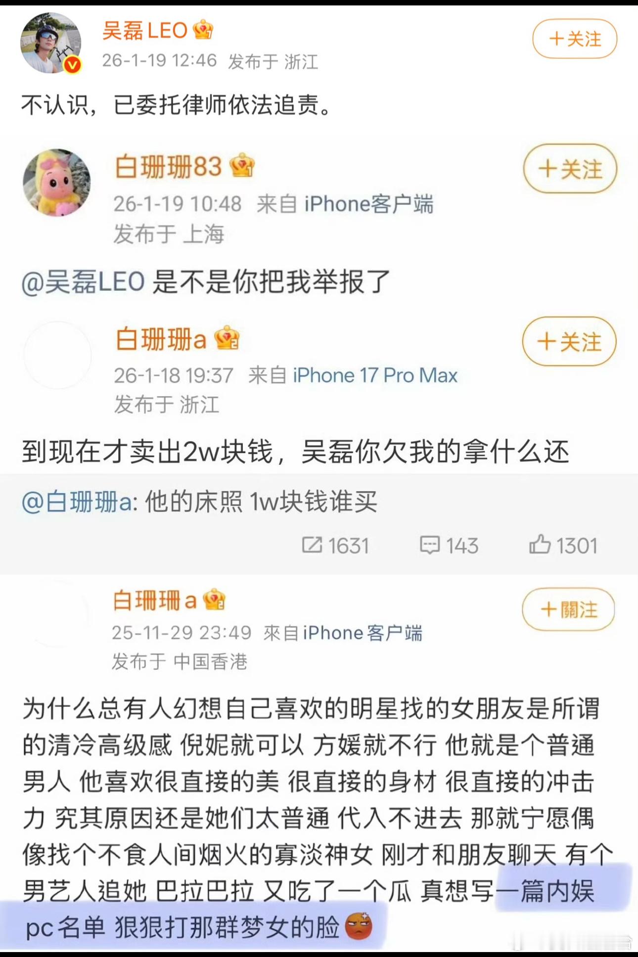 吴磊起诉白珊珊诽谤侵权1月18日晚,微博用户“白珊珊a”无凭无据喊话吴磊“你欠我的拿什么还”,公然以1万元/张叫卖所谓“床照”,甚至牵扯多位艺人无端躺枪,全程未出示任何实质证据。面对这场荒诞闹剧,吴磊工作室仅用68分钟就闪电辟谣,明确指控为“恶意捏造的谣言”,已通过区块链技术固定全平台证据,正式启动法律程序追究诽谤侵权责任,吴磊本人也直言“不认识”对方,否认任何交集。网友扒出关键反转:粉丝晒出《剑来》剧组通告单,证实吴磊被指的“澳门行程”当日实则在浙江拍戏,时空完全矛盾;而白珊珊存在IP跨省跳动、建群收费后解散、盗用网络图片伪装名媛等可疑操作,可信度彻底崩塌。娱乐吴磊 白珊珊