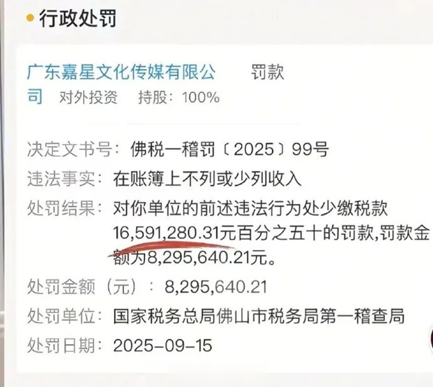 具体而言,周珍实际控制的“广东嘉星文化传媒有限公司”虚报营业额,逃税高达1659.13万元。有关部门查处过后,对周珍名下公司处以829.56万元的罚款。加上追缴的税款和滞纳金,涉案总金额接近2500万元,对于大多数普通人而言是一个天文数字。