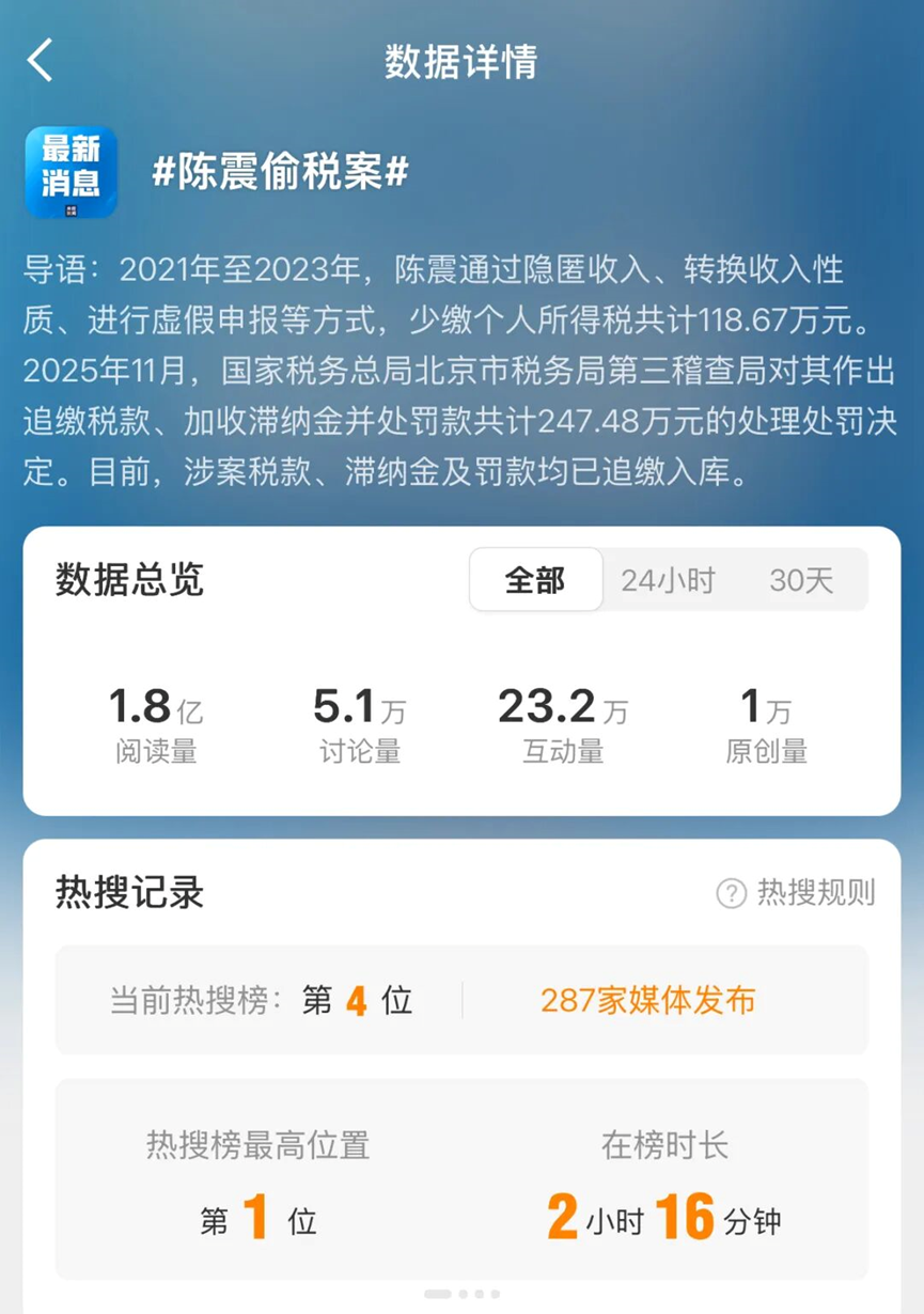 税务部门发现,2021—2023年期间,陈震每年申报综合所得仅100多万元,这与他的网络热度和广告报酬严重不符。经调查,陈震果然在2021年至2023年期间,通过隐匿劳务报酬、转换收入性质等手段,少缴个人所得税共计118.67万元。最后的处罚结果是,陈震被追缴税款、滞纳金并处罚款,合计247.48万元。