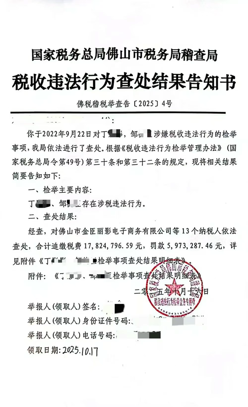 后续,经有关部门查处,小影夫妇果然有税务问题,他们关联的佛山市金臣丽影电子商务有限公司等13个纳税人存在明确违法行为,最终合计被追缴税费1782万元、罚款597万元。