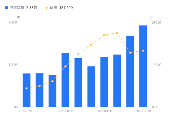 日期A股户数(户)流通A股户均持股数(股)户均持股市值(万元)2025-12-19232652046.0238.402025-11-28202492350.7742.562025-10-10149713179.5278.492025-09-30143473317.8179.632025-08-29116324092.2285.122025-08-20139363415.6659.892025-08-08154503080.9541.812025-07-3092005173.9844.692025-07-1896494933.2234.782025-07-1095984959.4331.17