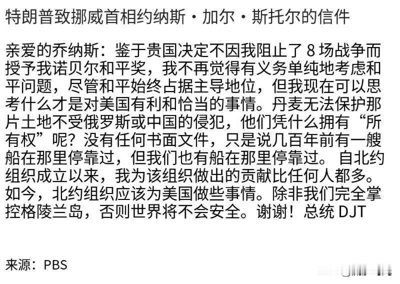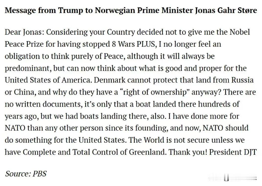 川普给挪威首相Jonas写的信: “亲爱的Jonas:鉴于你们国家决定不给我颁发诺贝尔和平奖,而我已阻止了至少8场战争,甚至更多,我已经不再觉得自己有义务只从‘和平’的角度去思考问题。虽然和平依然很重要,但我现在也可以考虑什么才是对美国最有利、最正当的选择。丹麦根本无法保护那块土地不被俄罗斯或中国觊觎,而且他们凭什么就拥有所谓的‘所有权’?根本没有任何成文文件,只不过是几百年前有条船在那里登陆过而已,我们当年也有船登陆过。自北约成立以来,我为北约做的贡献比任何人都多,现在,北约也该为美国做点事情了。除非我们对格陵兰拥有完全、彻底的控制权,否则这个世界就谈不上安全。谢谢!总统DJT